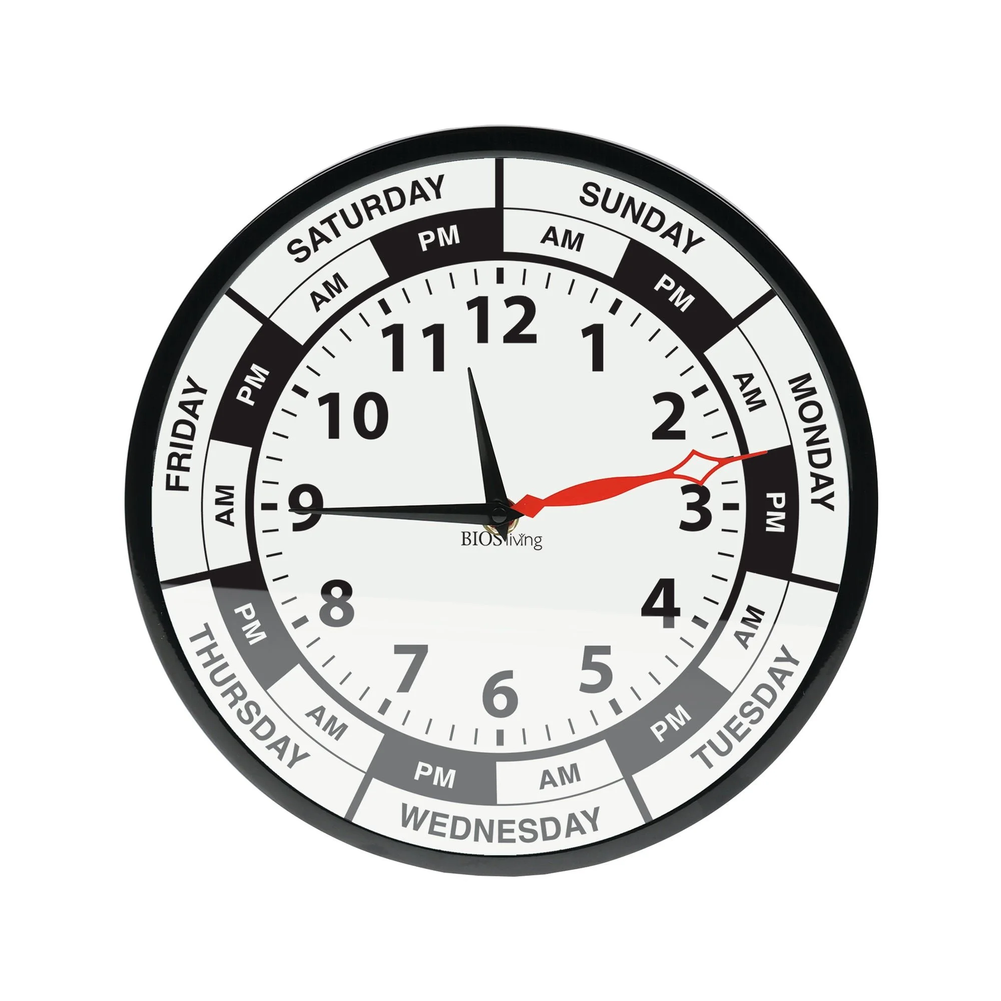 Designed for seniors and those dealing with Dementia. In the early stages of Dementia individuals start to lose track of days, and morning or evening. The red hand points to the day of the week and indicates AM or PM.