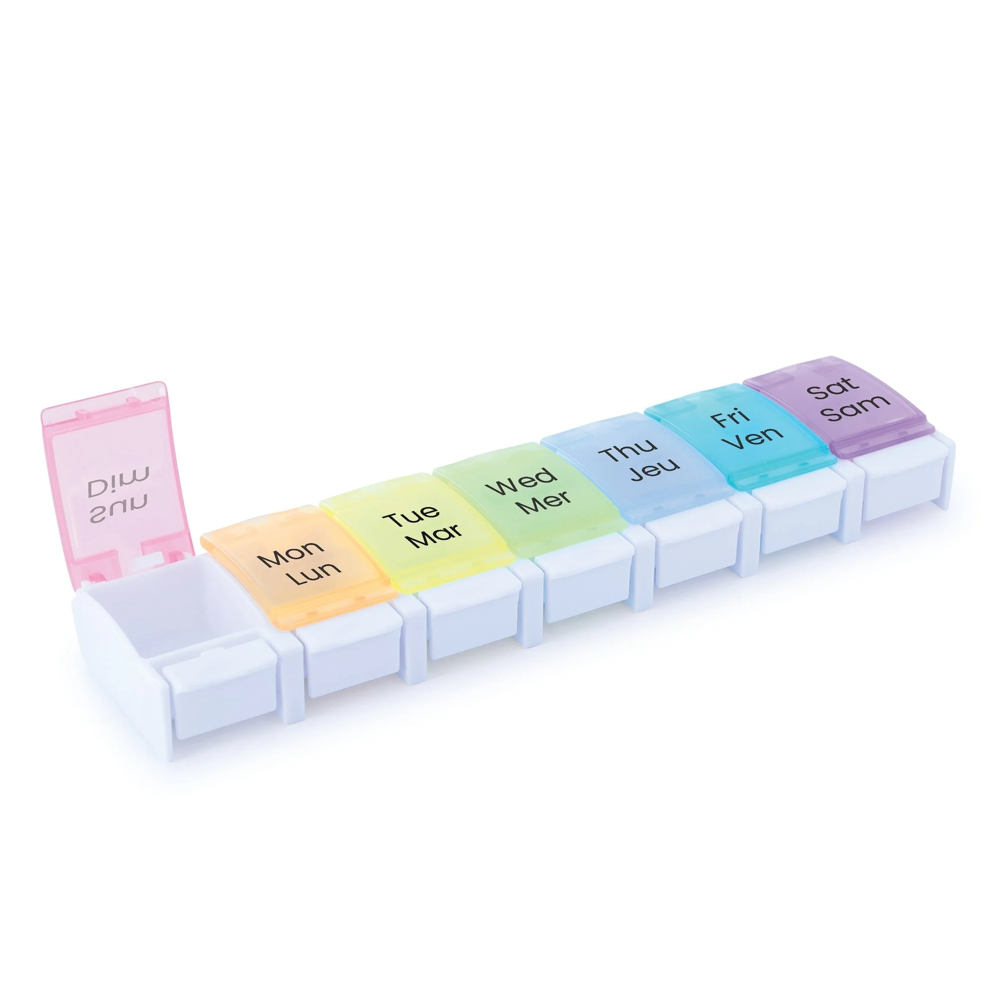 Easy open pill box is perfect for anyone with dexterity issues. Simply press down on the tab and the translucent pill module lid pops open. It’s perfectly sized for travelling.